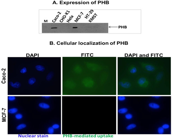 Western blot (A) and cytochemistry (B) analyses of PHB expression [10] in humans (Caco-2, HeLa, MCF-7, HT-29, and KMST-6) and Chinese Hamster Ovary cells. Expression of PHB was detected only in Caco-2 and MCF-7 cells (A). Fluorescent microscopy revealed uptake of AHP-Fluorescein isothiocyanate (AHP-FITC) by Caco-2 cells, indicating expression of PHB on the cell surface. No AHP-FITC fluorescent was observed in MCF-7 cells, which indicates that the PHB receptor is not on the cell surface. Reproduced with permission from Future Medicine Ltd. [10].