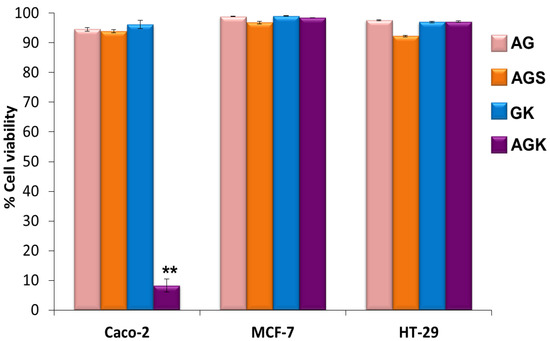 Investigation of the specificity of AGK against colon and breast cancer cells. AGK selectively targets and kill cells that express PHB on the cell surface. Adapted from Sibuyi et al. [10]. Abbreviations: AG—cAuNPs + AHP, AGS—cAuNPs + AHP + non-specific peptide, GC—cAuNPs + KLA, AGK—cAuNPs + AHP + KLA. ** The difference is statistical significance at p < 0.001 for Caco-2 cells treated with AGK when compared to MCF-7 and HT-29 cells. Adapted from Sibuyi et al. [10].