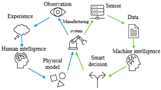 At present, researchers are becoming more aware of the value of data, its collection and analysis and are trying to identify ways to use it effectively within manufacturing processes. Figure 2 represents the current process of acquiring data from manufacturing processes and analysing it for the optimal decision toward the optimization of the manufacturing system. This cycle lays the foundation for a data-driven manufacturing paradigm as opposed to conventional model-based manufacturing [17]. Systematic analysis of manufacturing data has the potential to lead to decisions that can improve the efficiency of smart manufacturing [16]. The main difference between the conventional manufacturing process and the modern/smart manufacturing process can be observed in Figure 3. Conventional manufacturing processes in the context of automation can be seen as model-based manufacturing. Experts gain experience through physical observation. Based on this experience, physical models are created through experimental and numerical methods. Such models have added value but their limitation is the extent of efficiency and accuracy as a consequence of the human factor in the process. Intelligent manufacturing that is data-driven makes full use of all manufacturing processes and their real-time data to achieve system flexibility and autonomy [17].