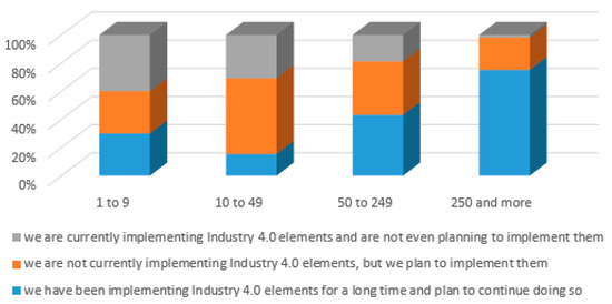 Figure 4 represents the percentage of Industry 4.0 implementation depending on the size of the organization. Based on the Chi-square test, the calculated correlation coefficient, and the graphical representation, we can confirm that the implementation of Industry 4.0 depended on the size of the organization. The larger the organization, the more likely it was to implement the different technologies of Industry 4.0.