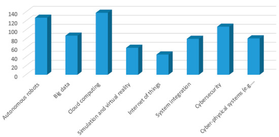 Based on the responses of respondents from each industrial organization (Figure 5), we identified that the most commonly deployed element was Cloud Computing, indicated by 138 (41%) respondents, followed by Autonomous Robots, indicated by 127 (38%) respondents and Cybersecurity, with 107 (32%) respondents. A surprising result was that the Industry 4.0 Internet of Things (IoT) element was marked by only 45 (13%) respondents. IoT is used to connect Cyber–Physical systems with cloud solutions and we did not assume that organizations did not have their systems interconnected. We can only state that this is an anomaly when respondents did not have enough knowledge regarding IoT and thus could not properly define the operation of this technology within an organization.