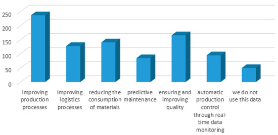 Digitalization is becoming a crucial factor in increasing competitiveness now and in the future. It is driven by data and leveraging it to its best advantage. By making efficient use of the available data, organizations are able to make decisions and analyses in order to meet their objectives, e.g., reducing costs, improving the use of production capacity, increasing quality, improving product features, etc. Therefore, in the next section, we focus on the current ways/opportunities of data use in organizations (RQ4—see on Figure 6—should correctly be Figure 5).