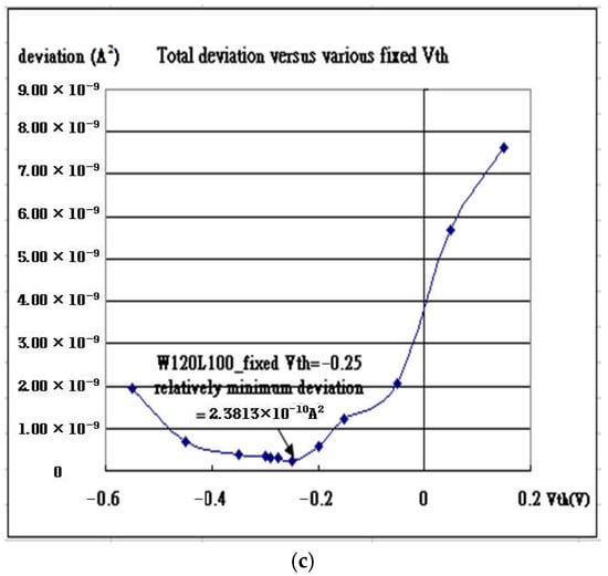 As shown in Figure 2a–c, the transistor W120L160 has the final Kn = 1.36 × 10−4 A/V2, λ = 0.170 (1/V), and Vth = −0.150 V. In addition, the corresponding minimum deviations are 8.82 × 10−10 A2, 2.14 × 10−10 A2, and 1.83 × 10−10 A2, respectively. The value Vth = −0.150 V and the final minimum deviation 1.83 × 10−10 A2 has the final minimum deviation as compared with the other two ways of parameter-fixing.