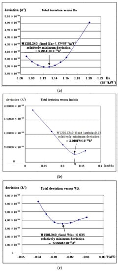 W120L240 (a) Total deviation by summing over each deviation of (IDS,VDS) versus various fixed Kn values obtaining the minimum deviation to determine the chosen Kn; (b) versus various fixed λ values obtaining the minimum deviation to determine the chosen λ; and (c) versus various fixed Vth values obtaining the minimum deviation to determine the chosen Vth.