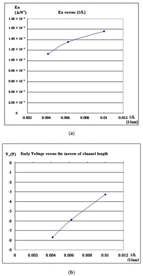 For fixed lambda, three respective lambdas of the three transistors with the most minimum deviations determine the corresponding Early voltage values, which are plotted linearly against the inverse of channel lengths, as shown in Figure 4b. That characterizes the channel-length-dependent leakage current, i.e., the shorter the channel length, the leakier the transistor across source and drain. This Early-voltage-related leakage current may get larger, which is not expected as the channel length gets shorter.