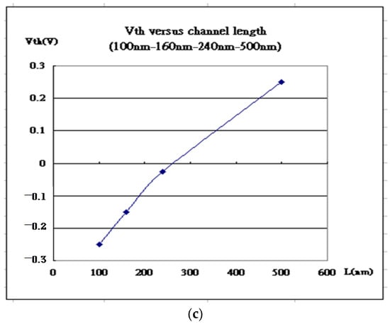 One intriguing observation is concerning negative Vth values. As shown in Figure 4a, Vth values plotted against channel length, surprisingly, is seen to be linear and the slope is determined to be 1.6071 (Volt/micron), as presented in Equation (4).