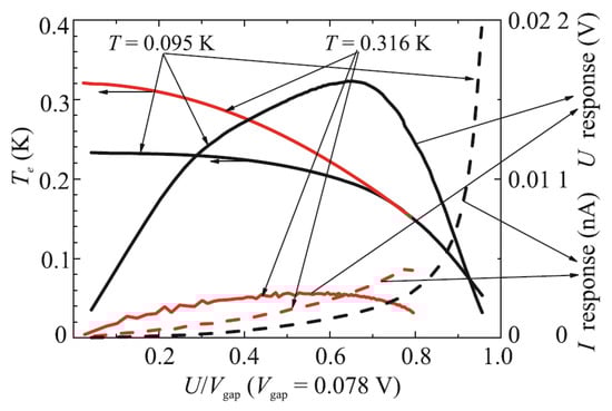Voltage dependences of the electron temperature of the normal absorber of the detector (left scale) and of the voltage and current responses (right scale) at temperatures of (0.095 ± 0.01) K and (0.316 ± 0.02) K when irradiated with a black body radiation source. Red lines show the results for the temperature of the sample holder T = 0.32 K, with black lines for the temperature T = 0.1 K. Solid lines belonging to the right scale show voltage responses, while dotted lines show current responses. Graph from [30].