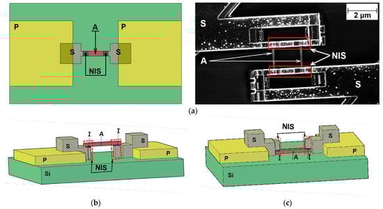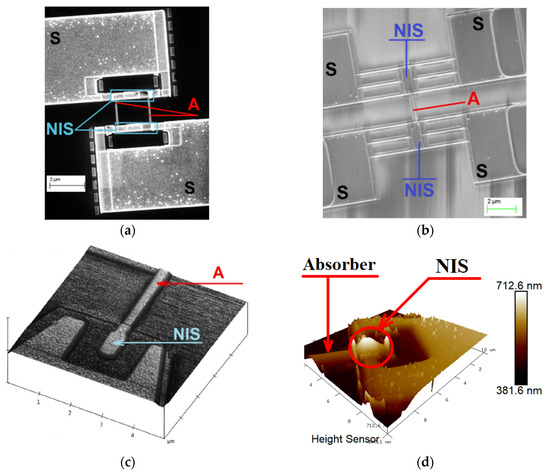 Photos of samples fabricated via different technologies (A—absorber; NIS—normal metal–insulator–superconductor tunnel junction; S—superconducting electrodes): (a) Dolan’s technique; (b) bridge-free technology; (c) direct-write trilayer technology; (d) direct-write separate lithography technology with magnetron sputtering.