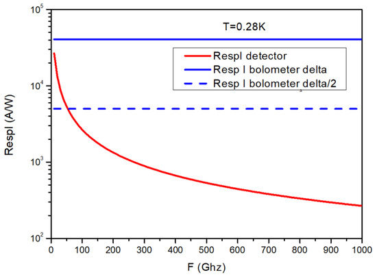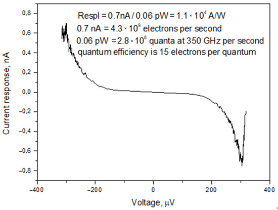 Estimations of responsivity, in this case, are based on nonequilibrium electron and phonon distribution functions and mechanisms of quantum absorption [12]. The important figure is the quantum efficiency, which is equal to the number of excited and detected electrons for one absorbed photon. It can approach the value of n = hf/kT. However, if the dc bias is close to the energy gap, electron cooling effectively removes excited electrons from the absorber. Excited electrons cannot be multiplied, and the quantum efficiency drops to n = 1. According to this model, we can distinguish two operation modes: photon counter and quantum detector–multiplier modes. The current responsivity in the first case is dq/dE = e/hf, and it is e/kT in the second case. With an increase in frequency, the current responsivity of the photon counter drops, and when using a bolometer detector, the multiplier remains high—see Figure 5. The blue curve corresponds to the bolometric mode at a bias close to the gap voltage, with dI/dP = e/2kT = 2.2 × 104 A/W; the dashed blue line is the half-gap bias, and dI/dP = e/0.5Δ = 5 × 104 A/W; the red curve represents the photon counter mode, with dI/dP = e/hf = 762 A/W at 350 GHz.