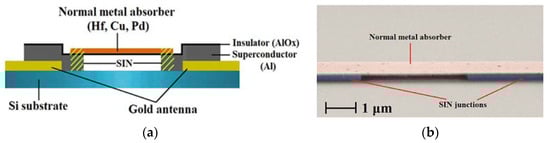 - Schmidt, D.R.; Duncan, W.D.; Irwin, K.D.; Lehnert, K.W.; Miller, N.A.; Ullom, J.N. Normal metal–insulator–superconductor junction technology for bolometers. Nucl. Instrum. Methods Phys. Res. Sect. A Accel. Spectrom. Detect. Assoc. Equip. 2006, 559, 516–518. [Google Scholar] [CrossRef]