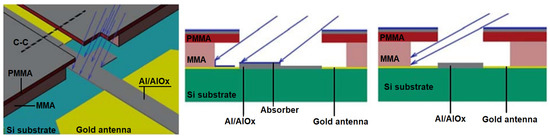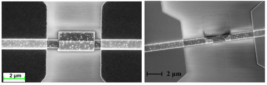 To avoid the chemical etching of a normal metal, we developed a process involving the shadow evaporation of the normal metal in the required area. A schematic view of this fabrication process is presented in Figure 10. This technology requires rather thick resists of over 900 nm. The absorber film is only deposited in the wider area, and in narrow (about 1 μm wide) areas, the metal is evaporated onto the wall of the resistor, before finally being removed together with the resist in the lift-off step. The process of Al with bridge etching is the same as in the previous process using Cu. SEM views of such samples are presented in Figure 11.