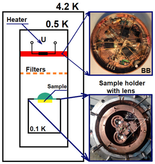 Sensitive experiments were performed in the dilution cryostat, which was inserted into the transport He dewar [42]. The lowest achieved temperature was 50 mK. Such a cryostat does not require external pumps that significantly reduce vibrations and electric jamming. By using a cryostat equipped with three sample holders, in one cooling cycle, it is possible to measure and compare the characteristics of three samples. The cryostat was equipped with a blackbody radiation source, and we studied the responsivity and dynamic range of samples at different radiation temperatures (the schematic of this experiment is presented in Figure 12) [14].