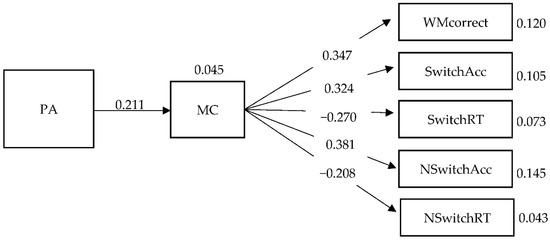 Except for the effect of MC on NSwitchRT, all other direct effects in the model (Table 3) were significant (p < 0.05). Similarly, all the indirect effects of PA on EFs through MC (Table 3) were significant, confirming the hypothesis that MC is an intervening variable in these relationships.