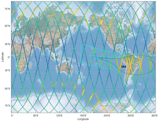 The extraction of EBs from the NOAA-15 database of CRs starting from July 1998 to December 2014 was performed using the same procedure as in previous analyses [26,27,28]. Being so, the starting set of EBs to correlate to EQs remained unvaried and is reported in Figure 2 of a past work [28]. These EBs were all in the loss cone with bouncing altitudes lower than 200 km, and for 95% of cases lower than 100 km, in correspondence to the South Atlantic Anomaly (SAA). Figure 1 reports the geographical distribution of the NOAA-15 trajectories in one day, where the electron flux distribution along the trajectory is represented in colors. The black contour in the center represents the SAA. As reported in previous analysies, see, for example, Figure 1 of [26], precipitating electrons were observed far from the SAA to the west up until 170° in longitude, indicated by the cyan contour of Figure 1. The space-time distribution of the detected EBs consists of a series of consecutive events corresponding to time intervals lasting up to a few minutes. Although, one or more non-consecutive detections characterized the space-time distribution of EBs along the single semi-orbit. Moreover, the observation of one or more EBs in a semi-orbit was defined as only an EB event. Being that the EB L-shells were limited at L < 1.4 by the requirements of precipitating particles from the inner Van Allen Belts, the time length of every EBs was always found less than 12 min. For what concerns the EB time, was defined as the average time among the times of selected EBs in the semi-orbit.