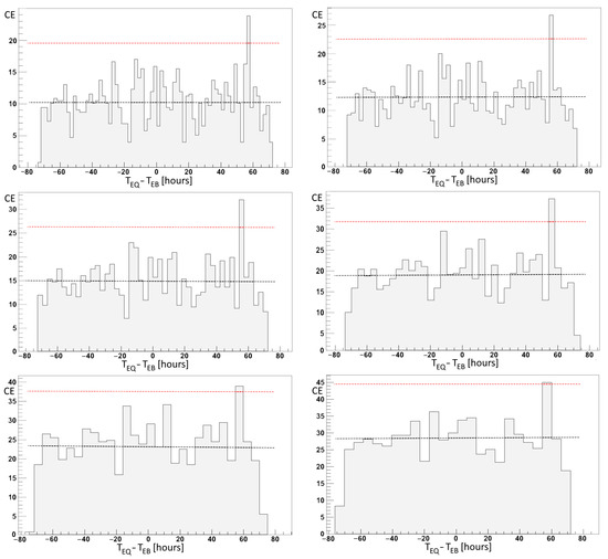 Correlations were obtained by filling histograms of the time difference TEQ − TEB which is positive when EBs anticipated EQs. They are plotted for different bins of 2, 2.5, 3, 4, 5, and 6 h from top left to right; the centers of correlation peaks are 57.2, 56.05, 55.8, 56.3, 57.3, and 57.2 h, respectively; averages are evidenced by the black horizontal dotted lines, while the red ones indicated the 3 σ levels; note that border bins are not completely populated as they are partially out the range of ±3 days.