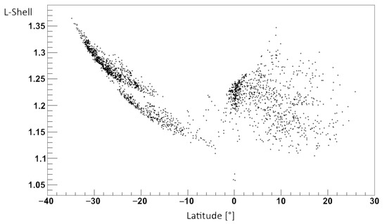A set of 6 correlation plots between 30–100 eV EBs and East Pacific M ≥ 6 EQs are shown in Figure 2 where the bin time interval was chosen between 2 and 6 h. A range of ±3 days was considered for the time difference between EQs and EBs, where TEQ − TEB positive highlights that EBs precede EQs, while EQs precede EBs for negative time differences. CE distributions were Poissonian as in past cases, and the average values are indicated using black dashed lines, while the red dashed lines are used for standard deviations. Significant correlation peaks appear at time differences around 57 h, which means that the EB observation anticipated the corresponding EQ. Unlike past works [26,28], where the correlation significance was represented by EQ projections at certain altitudes, here the correlation significance was calculated exclusively with respect to the EB features. In analogy with the case of West Pacific EQs [27], the L-shell interval of electrons to maximize the correlations between EBs and East Pacific EQs was obtained at 1.1 ≤ L ≤ 1.3. A plot of this EB L-shell parameter compared to latitudes is shown in Figure 3. The plot reports two distinct distributions, a correlation for negative latitudes and a lack of correlation for positive ones. For what concerns electron pitch angles, they were concentrated in intervals around 67° and 117°, with 56° ≤ α ≤ 72° and 108° ≤ α ≤ 126°. The correlations in Figure 2 were obtained for EQ depths lower than 200 km, supporting the hypothesis that only EQs close to the surface seem to be correlated to ionospheric activity.