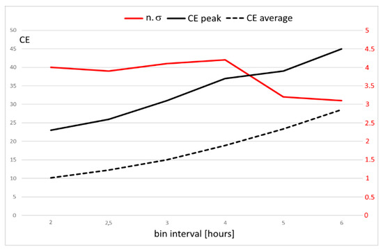 The significance of the correlation peaks was calculated for all the cases shown in Figure 2. The plot shown in Figure 4 summarizes the results regarding the number of standard deviations that define the correlation peak significance above the average values concerning the bin duration and the relative average correlated events. A statistical increase in the correlation peak significances was observed, which started to exceed 3 standard deviations for a bin correlation less than or equal to 6 h and reached a maximum of over 4 for a bin correlation of 4 h. The correlation peak significance was less than 3 for bins greater than 6 h. Concerning the number of correlated events, it decreases for short correlation bins. In Figure 4, a continuous red line indicates the number of standard deviations of 57 h correlation peaks observed with different bins, a continuous black line indicates the number of events at the peaks, whereas the dashed line indicates the averages. All the correlation peak significances overcame the threshold of 99%. As in the past publications, both correlation calculus using a randomized space and time distributions of EQs were also calculated by using the same EQ times, and the same EQ epicenters, respectively. In these randomized cases, the previously obtained correlation peaks completely disappeared.