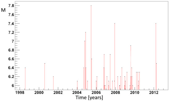 Statistical correlations between time series of strong earthquakes and time series of remotely collected signals have been recently obtained in several fields of electromagnetic observations [14]. A study lasting 7.5 years concerning Pc1 pulsations reported from a low-latitude station in Parkfield, California, an enhanced occurrence probability of such phenomena about 5–15 days prior to EQs, during the daytime [15]. A statistical correlation was calculated for ULF geomagnetic fluctuations, and this phenomenon anticipated moderate earthquakes by 1–5 days at Japanese ground stations [16]. Seismo-ionospheric effects on long sub-ionospheric paths have been investigated in amplitude variations of signals [17,18]. In a statistical study concerning VLF/LF wave paths, transmitter signal amplitudes revealed perturbations with a frequency excess of 3–6 days before strong seismic events occurred in 10 years [19]. Concerning the magnetometers onboard LEO satellites, shallow earthquakes with M > 5.5 have been anticipated by both magnetic field perturbation and electron density signals of 10−0.96+0.51·M and 10−3.46+0.83·M days, respectively, using the first 8 years of Swarm data [20]. A significant correlation between VLF wave intensity and strong EQs occurring at 0–4 h was observed in a statistical study using the micro-satellite DEMETER [21,22], where EQs were preceded by decreasing intensities. Furthermore, the largest occurrence rates of anomalies on TEC data from the global ionosphere map were correlated with strong superficial EQs, they occurred 1–5 days before the EQs [23,24]. Significant increases in electron density measurements observed on board the DEMETER satellite were correlated with moderate seismic events that occurred 10 to 6 days later [25]. A statistical analysis of NOAA POES data has evidenced Electron Bursts (EBs), which are sudden increases in electron fluxes, in the loss cone 2–3 h before the M ≥ 6 quakes in Indonesia and the Philippines [26]. This analysis has been recently improved upon by considering the interval of 1.5–3.5 h before strong EQs in the West Pacific and resolving the ambiguity of recognizing EBs without knowing the EQ epicenters a priori [27]. The aim was to develop a methodology for EQ forecasting and verification [28].
