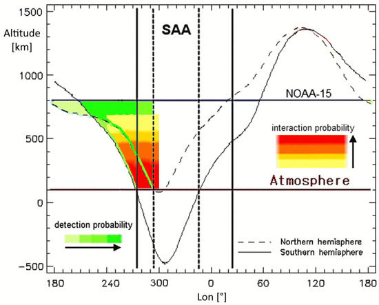 The electron mirror point altitudes at L = 1.2 are indicated by continuous and dashed lines, which are compared to continuous horizontal lines indicating NOAA-15 and atmosphere altitudes; green-colored areas indicate longitude regions where electrons are detectable, and the yellow to red areas indicate the probable interaction areas between EQs and EBs; arrows next to shades indicate increasing probabilities; the SAA region excluded by the analysis is delimited by vertical lines, which discriminate between the southern and the northern hemisphere using continuous and dashed lines, respectively.