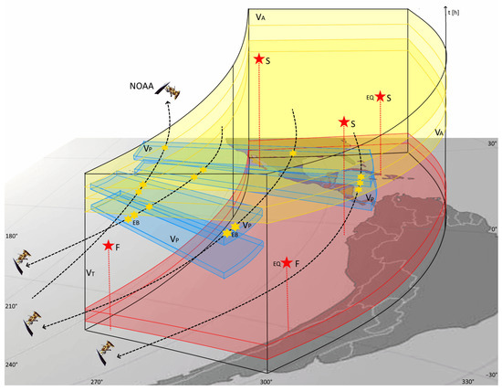 A way of using such results is to define a scenario for a short-time prediction model [27]. Following the work of Console [37], the representation of the EQ prediction model would need to define the target volume where EQs occur VT, which is a 2-d geographic space + 1-d time-space. This volume is displayed by a black contour in Figure 8, and with EQs occurrence by red stars. If an EQ occurs in the alarm volume VA in yellow, it is a success (S), while if an EQ occurs out of the yellow volume it is a failure of prediction (F). The precursor volume VP, which is generally different from VT, contains the alarm events. In this case, VP is the cyan volume of Figure 8 where EBs are detected, the time of EB observations lasting less than 12 min. When an EB is detected in VP it is an alarm that defines a VA. The time span of the EQ observations multiplied by the area of East Pacific where the correlations in Figure 2 are calculated is VT. An EQ event is included in this scenario only if M ≥ 6. Unlike West Pacific earthquakes where geographical areas of VP and VA were completely disjoined, areas of EQs and EBs are largely overlapping in this scenario. In this representation, VA has the dimension T which coincides with the correlation bin dimension, it is generated by an EB detection in VP, and covers the same area as VT. To have the greatest significance the 4 h bin interval of 54.3–58.3 h should be chosen. The VA dimension and shape are the same for each detected EBs in VP; if an EQ with M ≥ 6 occurs in VA one success is collected. Similarly, if an EQ occurs out of the VA, meaning that it happened before or after the 4 h between the 56.3 h following the EB, one failure is collected. Moreover, one false alarm is collected for any EB detection not followed by any EQ. Non-continuous VT is defined as when the Sun’s activity leads to discarding days or due to the NOAA-15 satellite intermittence into the detection area west of the SAA. A VA is generated within VT 56.3 h after an EB is detected in VP, and the time ahead is the vertical distance in the representation of Figure 8.