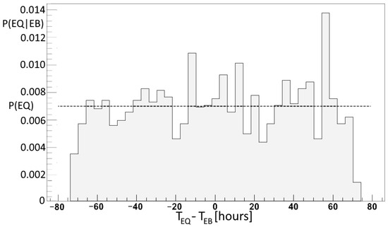 The conditional probability distribution P(EQ|EB) which corresponds to the correlation bin of 4 h in Figure 2, the average probability indicated by a horizontal dashed line coincides with the unconditional probability P(EQ).