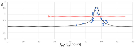 An early warning system for evacuation should be based on effective EQ observations [37]. However, the geohazard risk reduction can gain valuable preparation time by adopting a probabilistic short-term warning a few hours prior, especially for tsunamis [36]. Thus, using NOAA-15 electron CR analysis is in principle achievable based on the infrastructure of antennas operating along the West Coast of the US [28], at the same longitude where EBs are detected. The system would need to be able to download NOAA data early enough so it can be analyzed in a few minutes and then compared with geomagnetic activity within a day. As EBs were detected in the same region where they anticipated West Pacific EQs [27], the probability of a strong EQ in the West Pacific cannot be neglected, which would vanish in less than 4 h. Then, if no strong EQs occur in the West Pacific, based on completely statistical evaluations of disastrous events presented in this work, an East Pacific coast forecasting can be generated using G increases in EQ-probability. Moreover, correlation bins of time lengths greater than 6 h were investigated, they concerned the cases of 7, 8, 9,10, 12, 14, and 17 h. A decrease in significance was generally observed for the corresponding correlations, where the sigma decreased up to 1.1 for the 17 h case. Furthermore, the probability gain was calculated for each bin and reported in the plot of Figure 10 for each starting/ending time of the correlation peak. The case of 1.5 h was also added to this plot. A fit of the G distribution is reported in Figure 10, which can be interpreted as the time-dependent conditional probability of a strong EQ in the East Pacific area after an EB has been observed at time 0. Figure 10 shows that an increase in conditional probability is observed at about 40 h from the NOAA detection, around 54 h the probability magnitude overcomes the 99% significance level up to around 59 h. Finally, the probability decreases at an unconditional level around 70 h after the EB detection.