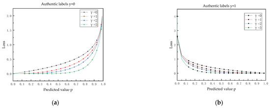 Focal loss decay curve. (a) Authentic labels y = 0. (b) Authentic labels y = 1.