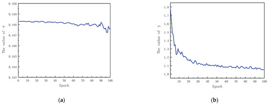 Figure 6 records the changing trends of α and γ during the training process (where α and γ are the mean values in each round of training). It can be seen from Figure 6a that the value range of α in this paper is calculated to be stable from 0.447 to 0.449 according to the number of positive and negative samples. It is close to the α value of 0.5 for the optimal effect in Table 5. Prove the validity of the dynamic α value. The value of γ in Figure 6b shows a trend of gradual decay. The network recognition effect is poor in the early stage, and the gap between the prediction and the true value is large, so the value of γ is large. In the later stage, with the emphasis on difficult samples, the network recognition effect is good, and the prediction effect is good. The gap between the prediction and the true value is small, and there are few difficult samples, so the γ value is small. The decay of the γ value reflects the process of difficult samples from more to less, which proves the effectiveness of the Focal loss algorithm with dynamic weights.