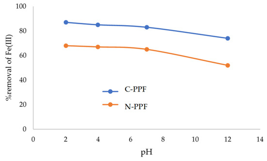 The solution pH is the most essential component in the adsorption process. It can be influenced by adsorbate species dissociation and adsorbent surface chemistry. The influence of pH on the adsorption of Fe(III) onto N–PPF and C–PPF was studied at pH 2, 4, 7, and 12. The two adsorbents showed similar characteristics of adsorption behaviour. The highest percentages of Fe(III) removal for C–PPF and N–PPF were observed at pH 2, at 92.00% and 91.20%, respectively (Figure 5). Because the adsorbent is a fibre with a negative surface charge, the efficiency of Fe(III) removal decreased as the pH of the solution increased. This could be due to hydrogen bonding between Fe(III) and the surface of the adsorbent. However, pH 4 was chosen for subsequent experiments because the removal efficiency of Fe(III) at this pH was comparable to that at pH 2. At a pH greater than 4, however, Fe3+ ions reacted with OH− and formed the sediment Fe(OH)3, resulting in decreased adsorption of Fe3+. Therefore, pH values of 2–4 are the most suitable for adsorption as there is no conflict with OH−, yet Fe3+ ions have sufficient opportunity to completely bind to the active site of adsorbents [4,10,28].