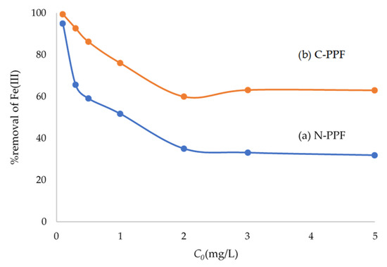 The removal of Fe(III) on N–PPF and C–PPF at initial concentrations varying from 0.1–5 mg/L are shown in Figure 7. The percentage removal of Fe(III) decreases gradually as the initial concentration of Fe(III) increases. It can be observed that the percentage removal limit of the adsorption process is at high concentrations [27]. At a high concentration, the position of the adsorption sites will be decreased. This behaviour is connected to competitive diffusion Fe(III) ions processing through pores in both biosorbents. This is because it will prevent the metal ions from passing inside the pores of the adsorbent, which is the adsorption that occurs on the surface of both biosorbents [19].