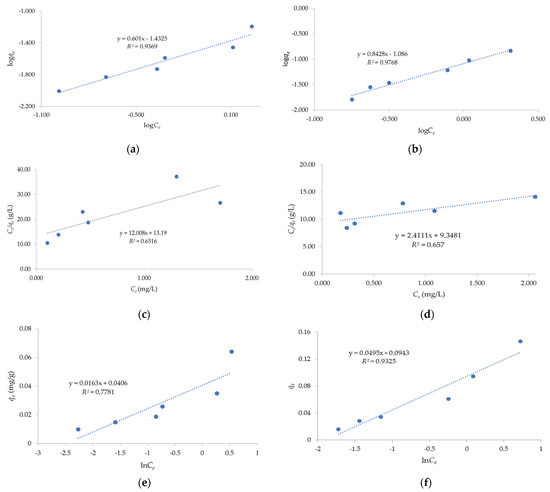 The equilibrium adsorption data were analysed in linear form using Equations (3)–(6), which correspond to three different isotherm models of Langmuir, Freundlich, and Temkin. The mass balance relationship was used to calculate the amount of adsorbed Fe(III) (qe) [10,18,19,35]: