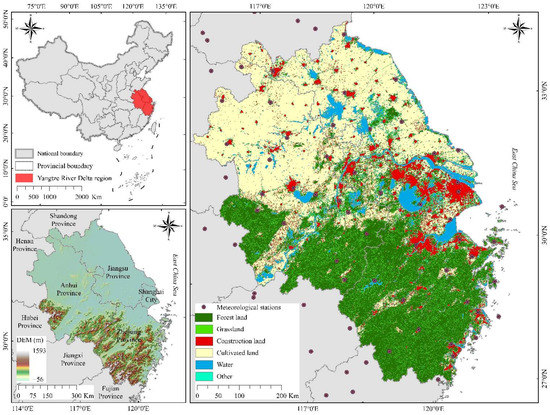 Location of the Yangtze River Delta region with DEM and land cover types.