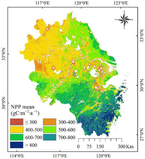 Average NPP distribution in Yangtze River Delta from 2000–2019.