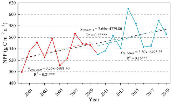 Average NPP Trends in Yangtze River Delta during 2000–2019. The mark (***) indicates relative levels of significance with p < 0.001.