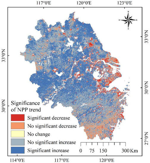 In addition, the results of the Theil–Sen estimator for NPP, during the period of 2000–2019, indicate that the area of positive β values was significantly larger than the area of negative values. Specifically, 85.90% of the regions had increasing trends and 14.10% of the regions had decreasing trends, and the mean value of β was 1.63, which indicated that the NPP in the research region had been in an overall increasing trend in the past 20 years. We further performed the Mann–Kendall test on the NPP trends, and the results showed that there were significant spatial heterogeneity characteristics of NPP trends in the Yangtze River Delta (Figure 5). Among them, the percent of significant increase in the region accounted for 47.25%, and the percent of significant decrease was only 5.16%; no significant increase region accounted for 35.08%, and no significant decrease accounted for 12.51%. The percentage of regions with no change was extremely small and negligible. We observed that the significance of NPP in most of the research regions was in increasing trends (including significant increase and non-significant increase), and the significant decrease was sporadically distributed in the southern part of Zhejiang Province (e.g., Lishui city, Wenzhou city, Taizhou city), southeastern Jiangsu Province (e.g., Suzhou city, Nan-tong city), and Shanghai city.
