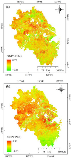 Due to its special geographical location, the research region is vulnerable and sensitive to climate change, as it is affected by both sea–land thermal differences and seasonal variations in circulation [12,59,60]. Some studies have shown that the growing season in the research region has experienced a dramatic warming and drying trend in the past 20 years [60]. However, the area of the research region is very large (358,000 km2, Figure 1), and the difference in elevation and climate are relatively significant within the region, e.g., the spatial distribution of temperature, annual precipitation, and sunshine hours are significantly different. This is reflected in the significant spatial heterogeneity of Pearson correlation coefficients of NPP with mean annual temperature, annual precipitation, and sunshine hours.