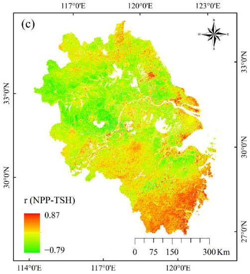 Pearson’s correlation coefficient between climate driving factors and NPP: Note: (a) ‘TEM’ means average annual temperature; (b) ‘PRE’ means total annual precipitation; (c) ‘TSH’ means total annual sunshine hours.