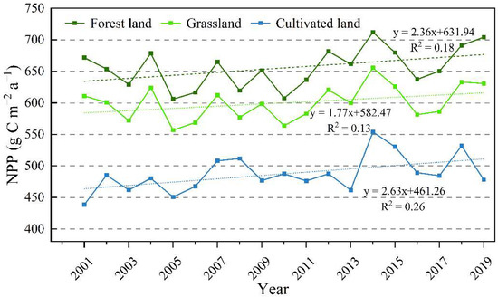 Different land cover types correspond to different land ecosystem structures, their NPP are also different, and the variability of land cover types and their spatial distribution directly determines the spatial distribution characteristics of NPP. As illustrated in Figure 11, considering the NPP corresponding to each land type during 2001–2019, forest land NPP (655.51 g C m−2 a−1) was the highest, followed by grassland NPP (600.12 g C m−2 a−1) and cropland NPP (487.51 g C m−2 a−1). Despite the large differences in NPP among different land use types, the NPP trends of forest land, grassland, and cultivated land were similar, with all showing an oscillating upward trend in which cultivated land had the fastest rate of increase, followed by forest land and grassland.