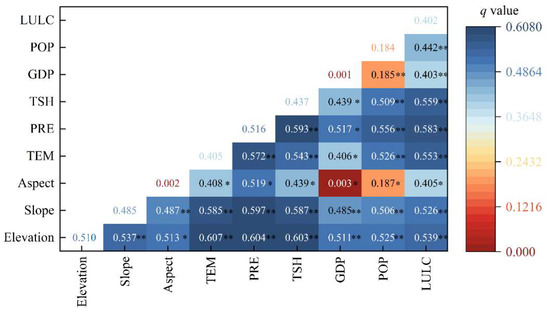 q-value of each driving factor. “**” represents passing the 0.001 significance test and “*” represents passing the 0.05 significance test. “TEM” represents the average annual temperature, “PRE” represents the total annual precipitation, “TSH” represents the total annual sunshine hours.