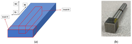 (a) Illustration of how the cuboid samples were cut from the cold-rolled samples. (b) Photograph of the sample after turning, where some part of the original cuboid was left untouched to keep track of the material axes.