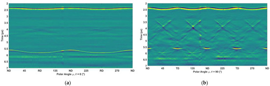 The black line on the cylindrical sample in the photograph shows where the LUS measurements were performed. A typical B-scan is shown below for the polar scans with rotations around the TD and RD axes. The first horizontal line around 2.4 µs is the first echo that has travelled through the cylindrical sample. This first echo exhibits double or quadruple symmetry as the polar angle is swept 360°, Figure 3a,b, respectively. The second echo, at around 5.75 µs, is sharp and continuous for the scan around the TD axis in Figure 3a, whereas in the scan around the RD axis, Figure 3b, this second echo is somewhat hidden behind other background signals.