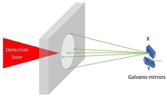 Schematic of the laser ultrasonic transmission measurement set-up, generating on one side and detecting on the opposite side. The Galvano mirrors can direct the generation point and the position is measured synchronously with the ultrasonic response. The detection and generating lasers are focused on opposite sides of the specimen.