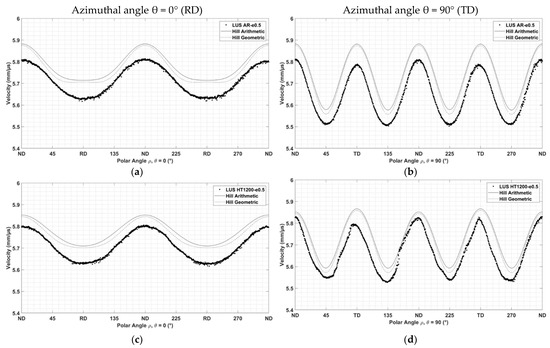 Plots of the longitudinal wave velocity are shown in Figure 8 for all four material conditions in both rotation series, i.e., with the rotations around RD and around TD, corresponding to azimuthal angles of 0° and 90°. In fact, the type and degree of anisotropy is rather similar in each material. There is a two-fold symmetry for rotations around the TD axis and four-fold symmetry for RD axis rotations.
