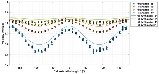 Also shown in Figure 8 are model calculations based on the textures measured by EBSD when enforcing symmetry on the calculated stiffness matrix. These are, in general, very close to the LUS measurements. Two sets of model results are included in each case. These refer to the Hill approximation used. It is universally assumed in the published literature that the Hill average is a simple arithmetic average of the Voigt and Reuss limit values. However, in his paper [19], Hill points out that a geometric average should be equally applicable, so this is also included in Figure 8. In fact, the differences are very small, although the geometric average appears to agree slightly better with the measurements than does the arithmetic one. This outcome is, however, sensitive to the crystal constants that are assumed (from literature sources), so a general conclusion on the relative merits is probably preliminary at the present time.
