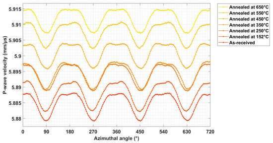 The cylindrical specimens of quenched martensitic steel were tempered for 1 h at temperatures up to 650 °C before measuring the wave velocities at room temperature. Figure 12 shows the resulting values through two complete revolutions of the samples. In general, the accuracy of ultrasonic wave velocities is mostly limited by the length of the wave path since time measurements are very exact. Due to the extremely constant path lengths in these lathe turned specimens, the precision of the values is very high and, from repeated measurements, can be judged to be significantly better than one part in ten thousand. The degree of anisotropy in individual specimens is only about 0.08%, and the repeatability is around 0.005%, as seen in Figure 12. In addition to these rotational measurements, P-velocities were also measured with high precision along the cylinder axis, i.e., along the plate’s normal direction.