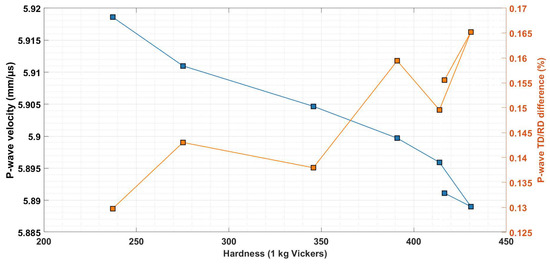 The blue square markers represent the longitudinal wave velocity in the normal direction for the tempered martensitic samples (left y-axis). The leftmost point is the 650 °C tempered martensitic sample, and the last point on the line represents the as-received sample, i.e., un-tempered. Orange squares and line show the anisotropic variation that originates from the (weak) texture.