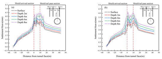Figure 8 shows the vertical displacement of stratum soil in monitoring section A. The field monitoring results show that the development law of ground deformation at 2 m, 4 m, 6 m, and 8 m below the surface with the advance of the shield is basically consistent with the ground deformation, and generally experiences the four development stages of time history change described above. The stratum with large deformation is 6 m below the surface (located in the middle and lower part of the silt–silty clay layer) and 8 m below the surface (at the bottom of the silt–silty clay layer). In Figure 8a, the cumulative maximum heave at 6 m below the surface is 4.21 mm, and the cumulative maximum heave at 8 m below the surface is 4.47 mm. In Figure 8b, the cumulative maximum heave at 6 m below the surface is 3.81 mm, and the cumulative maximum heave at 8 m below the surface is 4.09 mm. In Figure 8c, the cumulative maximum heave at 6 m below the surface is 3.29 mm, and the cumulative maximum heave at 8 m below the surface is 3.64 mm.