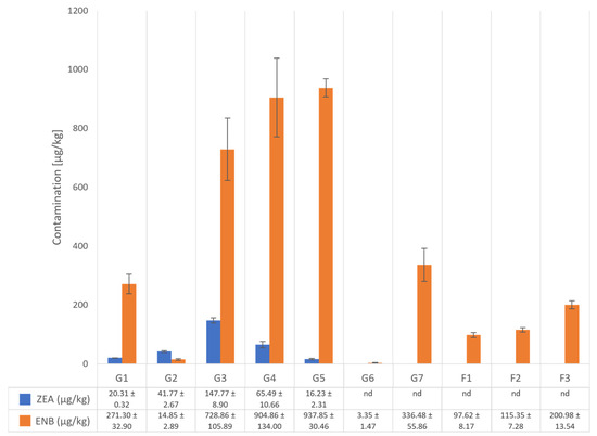 The results of both ZEA and ENB contamination in the wheat grains and wheat flours are shown in Figure 1.