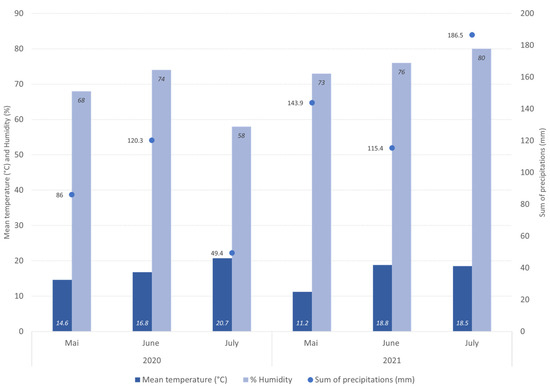 Average temperature, percentage of humidity, and total precipitation in Canton Vaud (Switzerland) for the months of May, June, and July of the years 2020 and 2021 (data from Agrometeo.ch, station Arnex-sur-Orbe).
