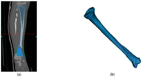 In order to reconstruct the patient’s data to 3D digitized model and design a custom-fit distal tibia fixation plate, a ~70 kg female human patient with a spiral distal fractured right tibia (fracture classified 43A1.1) was scanned by computer tomography, as shown in Figure 1 [33]. The patient’s bone was dislocated and fractured into two fragments. CT raw data is archived in standard Digital Imaging and Communications in Medicine (DICOM) format. The DICOM format files are then transferred and processed in MIMICS software (Materialise, Leuven, Belgium) for segmentation and obtaining the 3D digital models of the spiral fractured tibia. The 3D digital model was exported as “STL” format and imported and converted as a solid through Autodesk Inventor 2019 (Autodesk, San Francisco, CA, USA) software to be employed in the finite element bone-plate construct model.